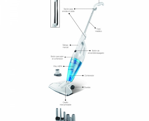 - Aspira Alfombras, Pisos y Tapices: Su diseño 2 en 1 permite limpiar con facilidad desde alfombras y pisos duros hasta tapices, brindando versatilidad y eficiencia en todo tipo de tareas de limpieza.