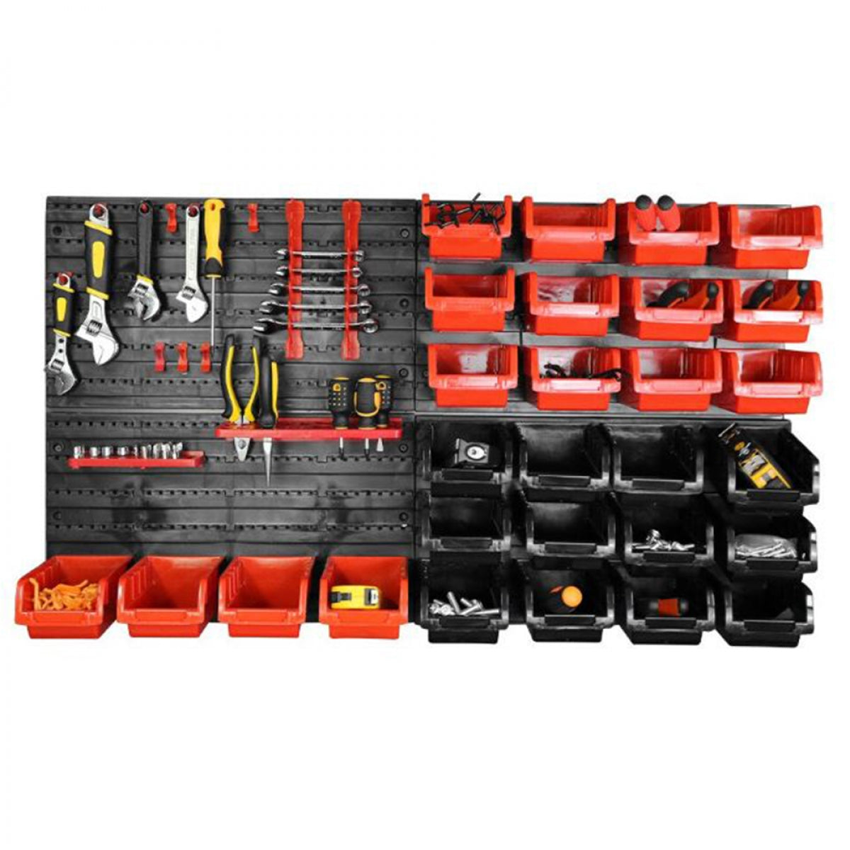 - Panel organizador de 46 piezas: Incluye 12 cajas de 160 x 102 x 75 mm, 16 cajas de 100 x 100 x 50 mm, 10 ganchos para colgar herramientas, un soporte porta llaves, un porta destornilladores y 4 tableros de pared.